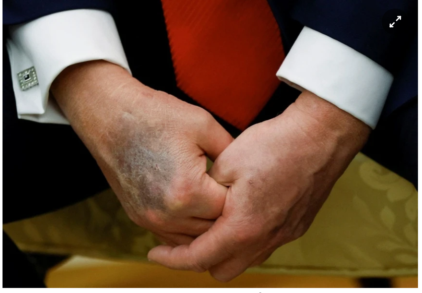 Một chi tiết gây chú ý là gần đây ông Trump nhiều lần xuất hiện với các vết bầm tím trên mu bàn tay phải. Một số ý kiến cho rằng đây có thể là dấu hiệu bệnh lý.