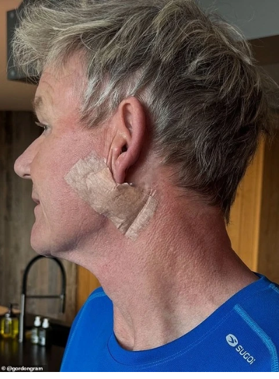 Ngôi sao truyền hình đăng tải hình ảnh băng gạc che một phần mặt và cổ, cùng một tấm khác cho thấy đường khâu kéo dài từ tai xuống cổ. “Biết ơn và trân trọng đội ngũ y tế tuyệt vời tại The Skin Associates vì đã nhanh chóng loại bỏ khối u biểu mô tế bào đáy này. Xin cảm ơn. Và xin đừng quên bôi kem chống nắng cuối tuần này”, Ramsay chú thích dưới bài đăng.