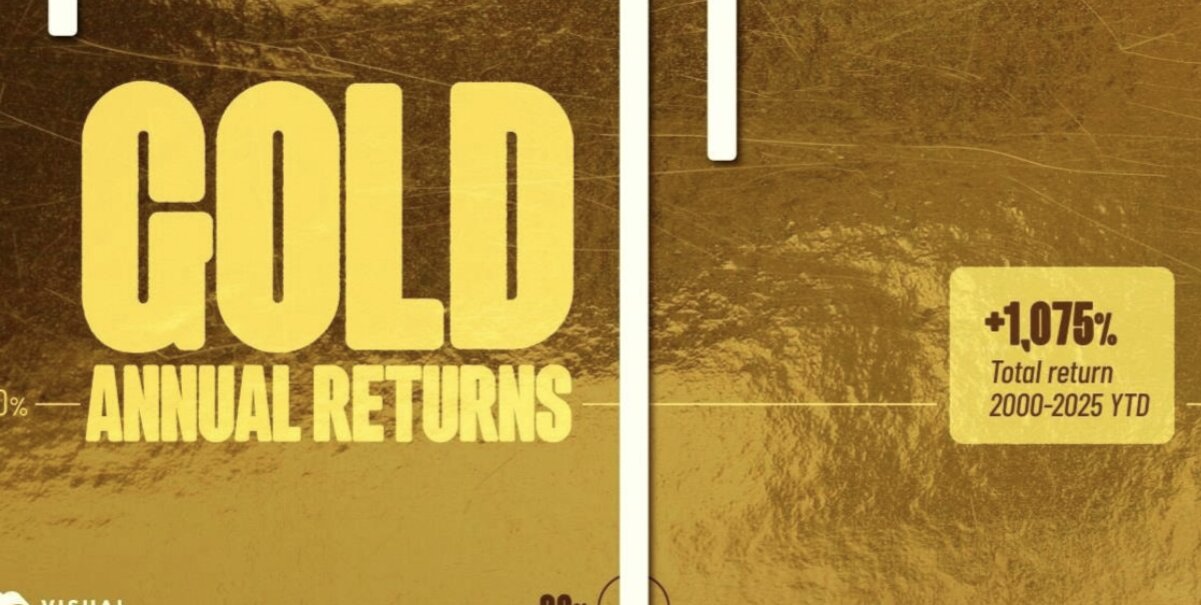 Từ năm 2000 đến 2025, vàng tăng mạnh tới 1.075%, với lợi suất trung bình hàng năm khoảng 10,9%.
