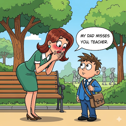Cô giáo đứng hình. Gió thổi nhẹ qua, nhưng không đủ làm dịu cái đỏ mặt đang lan dần trên má cô.