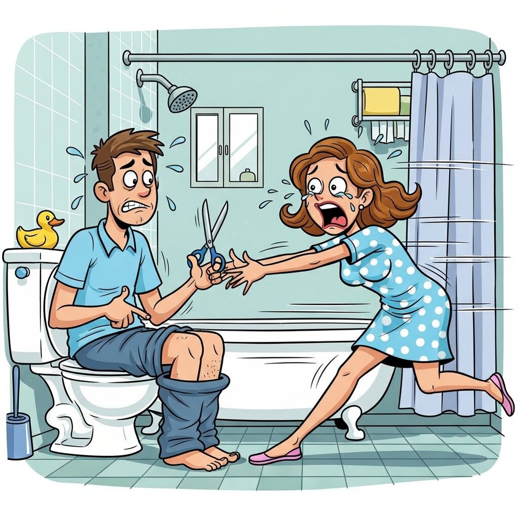 Đúng lúc đó, vợ đi ngang qua, liếc thấy chồng đang ngồi trong toilet, tay cầm kéo, mặt căng thẳng...