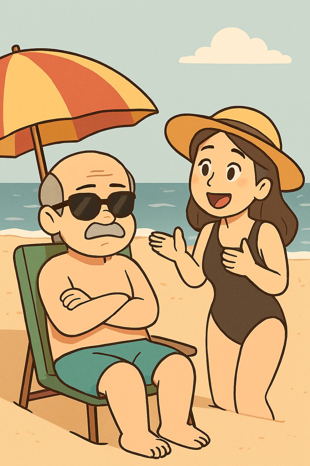 Một buổi sáng nắng đẹp, hai ông bạn đang ngồi phơi nắng trên bãi biển. Bỗng có một người phụ nữ tiến lại gần, mặt mừng rỡ: