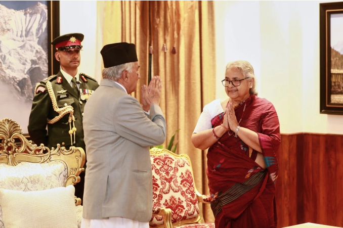 Bà Sushila Karki (phải) chào Tổng thống Poudel sau lễ tuyên thệ tại Kathmandu ngày 12/9. Ảnh: AP