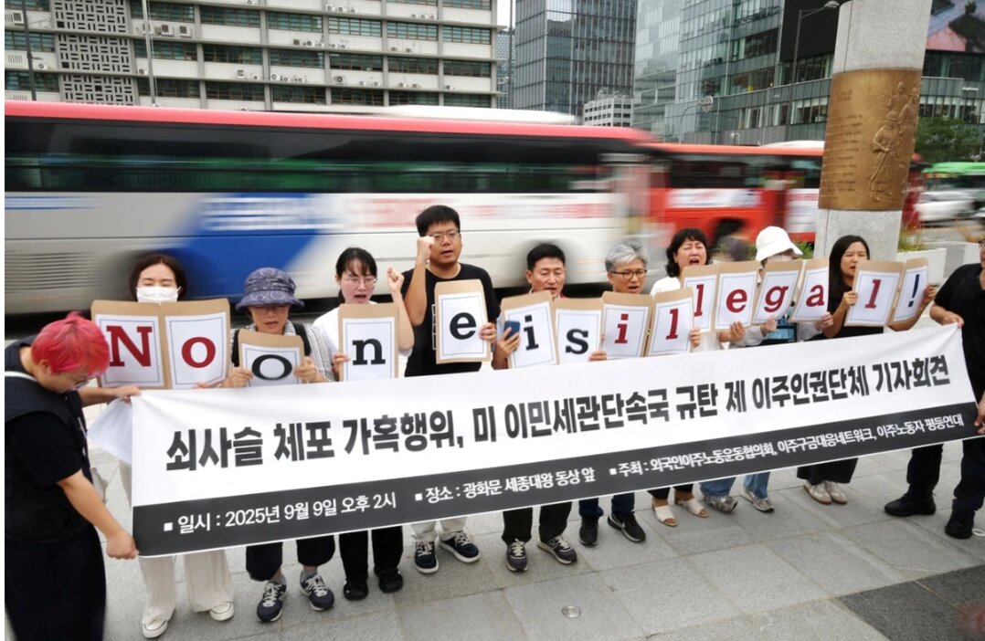 Các nhà hoạt động giơ cao biểu ngữ với dòng chữ “Không ai là người nhập cư bất hợp pháp!”, hô vang khẩu hiệu trong cuộc họp báo phản đối cuộc truy quét di trú quy mô lớn tại công trường dự án pin xe hơi của Hyundai Motor và LG Energy Solution ở bang Georgia (Mỹ) tuần trước, trước Đại sứ quán Mỹ tại Seoul, Hàn Quốc, ngày 9/9. Ảnh: Reuters.