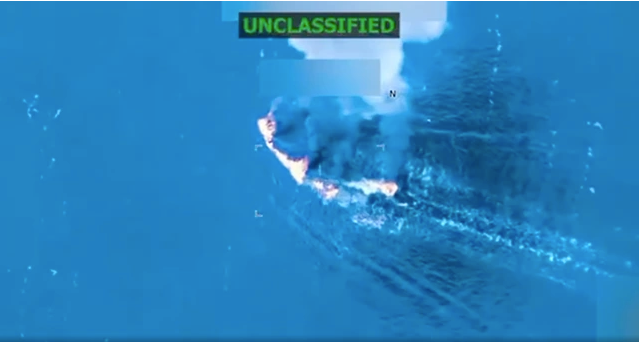 Chiếc tàu bốc cháy sau vụ không kích trong ảnh cắt từ video do Tổng thống Trump đăng tải vào sáng 20.9