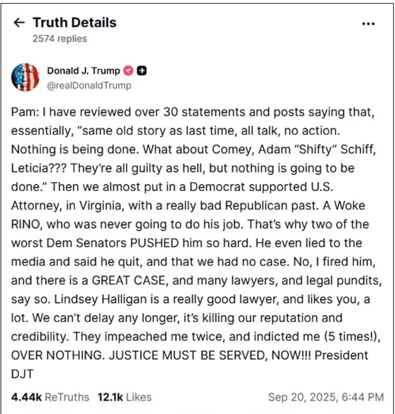 Ngày 20 tháng 9, Trump cũng tuyên bố rằng ông đang đề cử trợ lý cấp cao của Nhà Trắng Lindsey Halligan để tiếp quản vị trí công tố viên liên bang cho quận phía đông của Virginia.