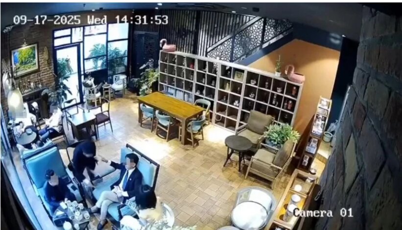 Một người trong nhóm khách dường như ra hiệu cho người đi cùng tiến vào trong hành hung nhân viên quán cà phê ngày 17/9. Ảnh: cắt từ clip.