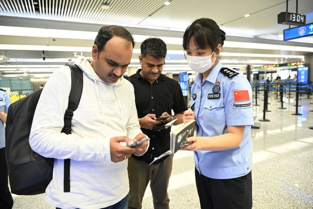 Nhân viên hải quan Trung Quốc hướng dẫn hành khách về thủ tục nhập cảnh tại sân bay Hồng Kiều ở Thượng Hải. Ảnh: VCG