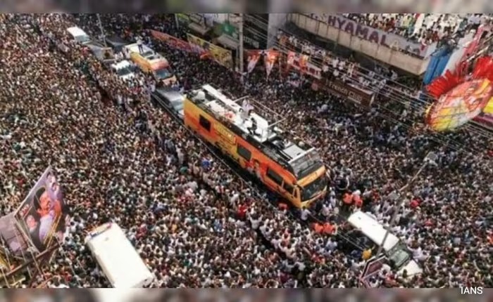 Xe buýt chở chính trị gia Vijay di chuyển qua đám đông. Ảnh: IANS