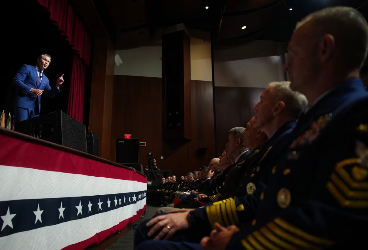 Bộ trưởng Quốc phòng Pete Hegseth phát biểu trước các tướng lĩnh Mỹ. Ảnh: GI.
