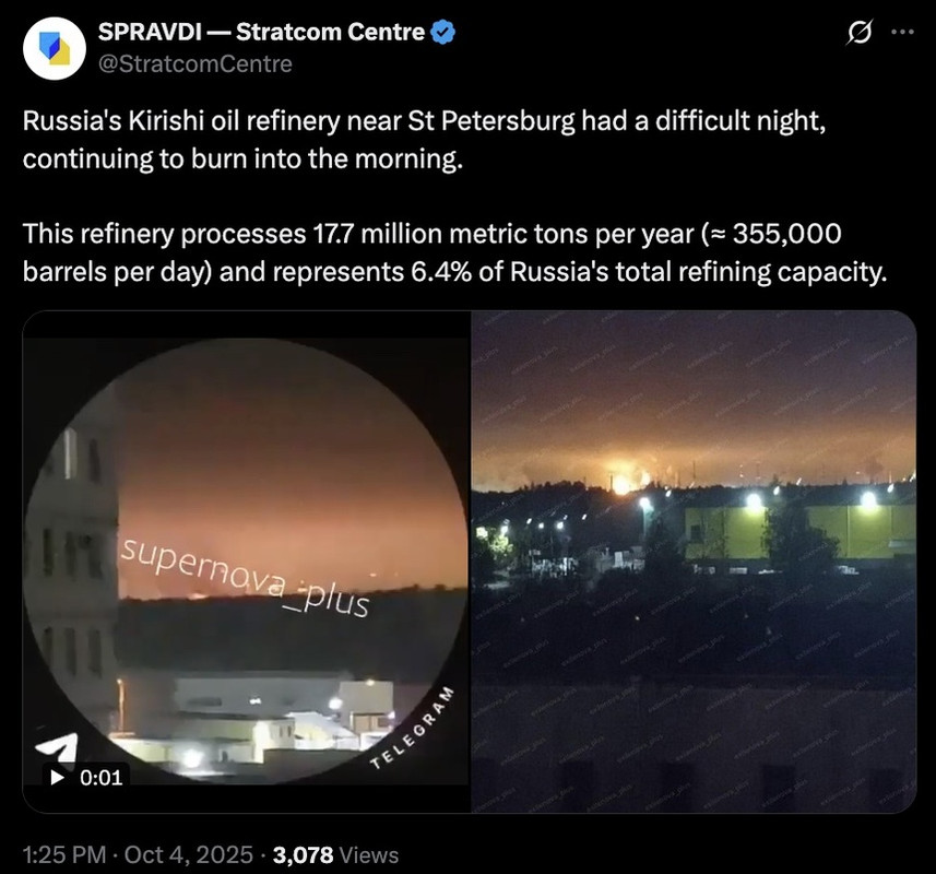 Chiều 4/10/2025, kênh SPRAVDI — Stratcom Centre đă đăng tải h́nh ảnh và video về vụ UAV Ukraine tấn công nhà máy lọc dầu Kirishi, thuộc vùng Leningrad của Liên bang Nga.tài khoản mạng xă hội X của SPRAVDI — Stratcom Centre.