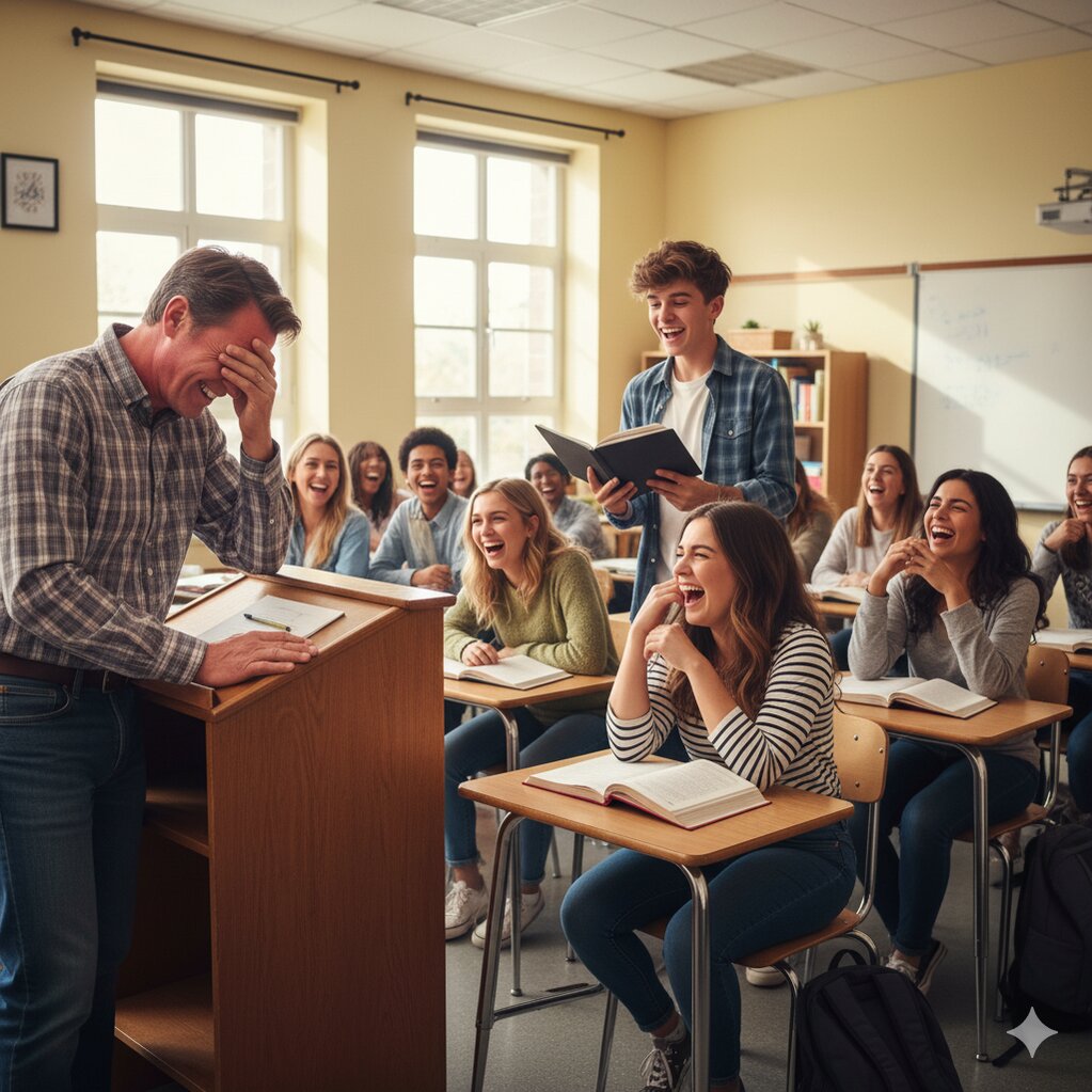 Cả lớp nổ tung tiếng cười, thầy tái mặt, cầm sổ điểm run run nói: