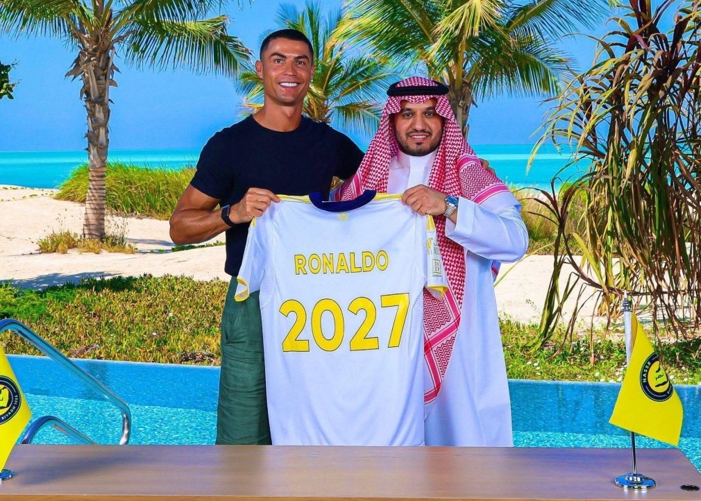 Cristiano Ronaldo (trái) và Chủ tịch Al Nassr, Abdullah Al-Majed trong thông báo gia hạn hợp đồng ngày 26/6/2025. Ảnh: Al Nassr