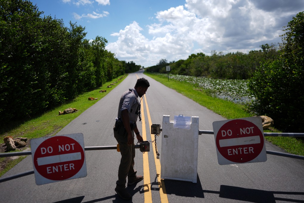 Nhân viên Cơ quan Công viên Quốc gia Mỹ chặn đường vào một khu vực ở công viên quốc gia Everglades, bang Florida ngày 1/10. Ảnh: AP