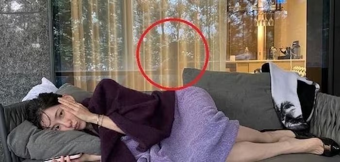 Trong số đó, bức ảnh Park Ji Hyun nằm trên ghế sofa với chiếc khăn quấn quanh người đã làm dấy lên tin đồn hẹn hò. Hình ảnh một người đàn ông đang quay phim Park Ji Hyun bằng camera điện thoại di động phản chiếu trên cửa sổ.