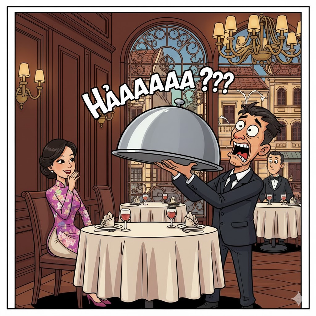 Một người đàn ông đưa vợ đi ăn ở một nhà hàng sang trọng trong khu phố cổ. Vừa bước vào, nhân viên phục vụ niềm nở hỏi: