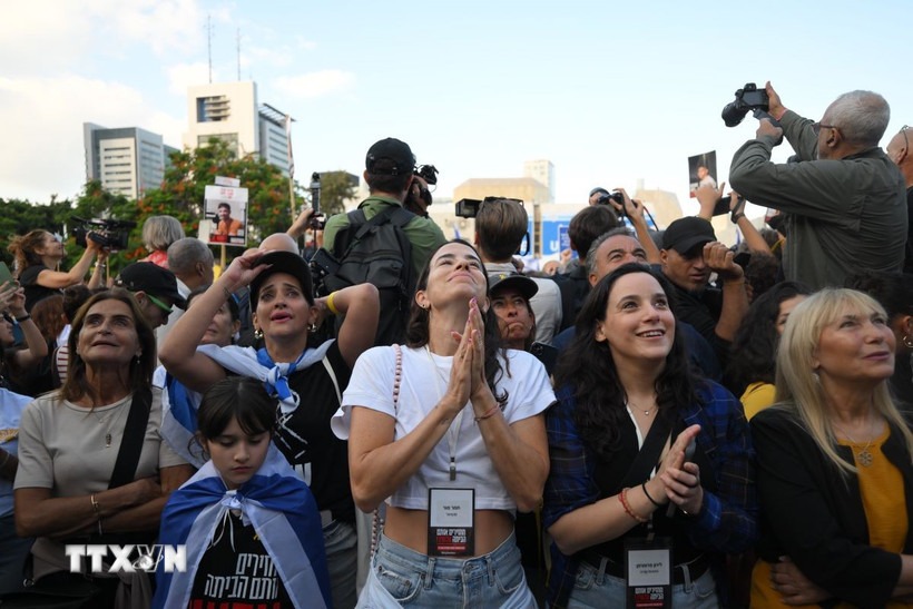 Người dân theo dõi chương trình truyền hình trực tiếp cuộc trao đổi con tin, tại quảng trường ở Tel Aviv, Israel ngày 13/10/2025. (Nguồn: THX/TTXVN)