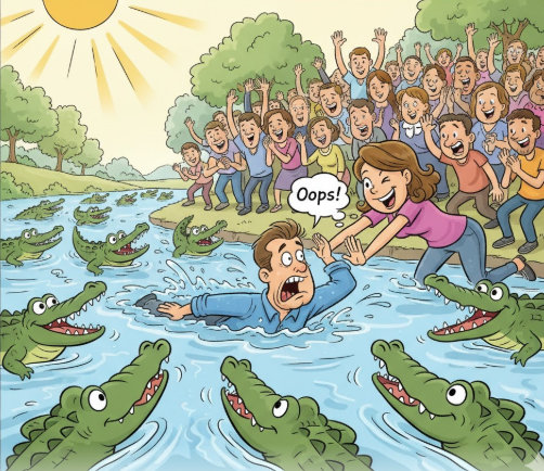 Một cuộc thi bơi qua ḍng sông toàn cá sấu được tổ chức. Ai bơi qua mà vẫn sống sẽ nhận thưởng 10 tỷ, c̣n nếu chết th́... được phúng viếng 50 tỷ.