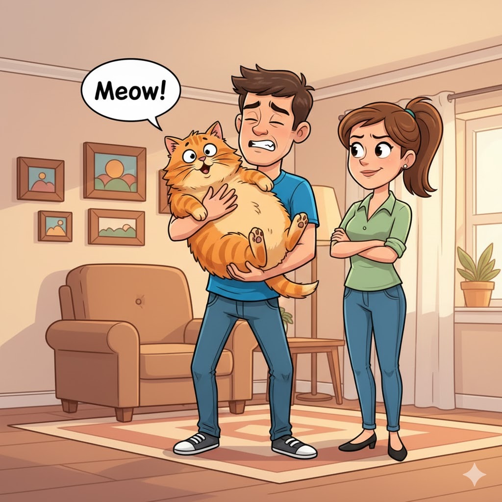 Anh chồng liền túm lấy con mèo, giơ lên hỏi với vẻ bí ẩn: