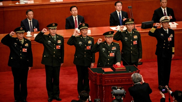 Ông Trương Thăng Dân (ngoài cùng bên trái) trong lễ tuyên thệ tại Đại lễ đường Nhân dân Bắc Kinh năm 2023. Ảnh: Reuters