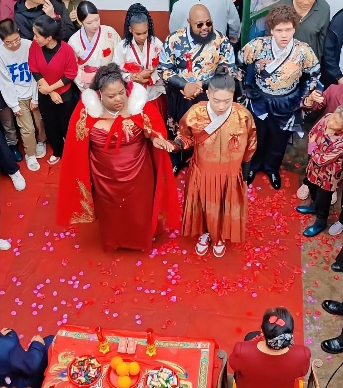 Trong ngày trọng đại, anh Trần mặc lễ phục đỏ, cô dâu diện váy đỏ tía, đội khăn voan thêu hoa văn và cầm pháo hoa bước lên xe hoa. Cả đoàn đến nhà chú rể làm lễ ra mắt cha mẹ, cô dâu đi cùng anh chị và con trai riêng 12 tuổi.