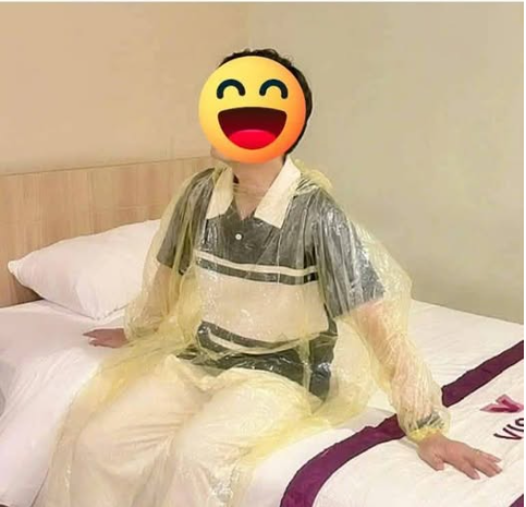 Vài phút sau, em bước ra, nhìn thấy tôi đang… nghiêm túc ngồi trên giường, áo mưa trùm kín người, hai tay đặt lên đùi như học sinh trực nhật — thì mặt em bỗng đỏ lên.
