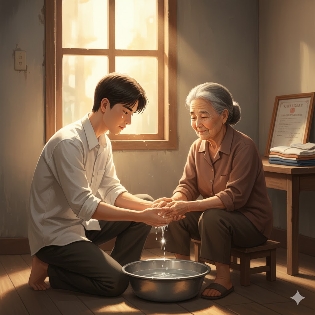 Sau khi rửa sạch đôi bàn tay mẹ, chàng trai trẻ lặng lẽ giặt nốt chỗ quần áo còn lại trong ngày.