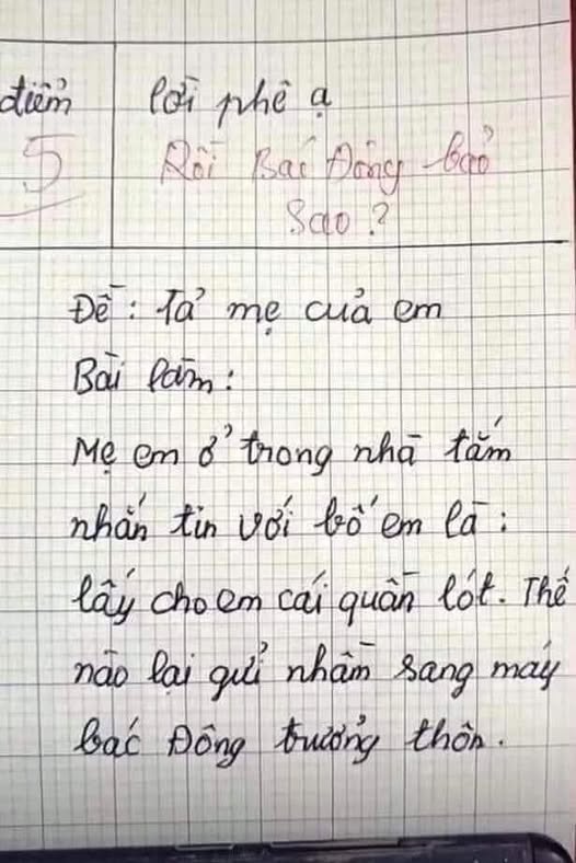 Cô giáo đọc xong, chỉ biết cho 5 điểm và phê một câu ngắn gọn mà đầy tâm trạng:
