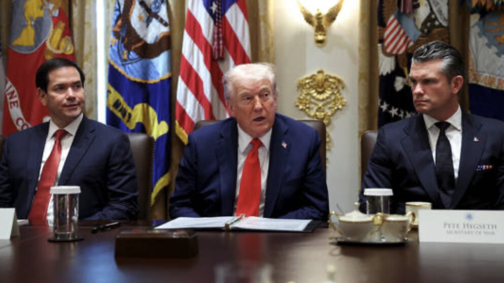 Tổng thống Mỹ Donald Trump (giữa), cùng với Ngoại trưởng Marco Rubio (trái) và Bộ trưởng Quốc phòng Pete Hegseth phát biểu trong cuộc họp nội các tại Nhà Trắng. Ảnh: Getty Images