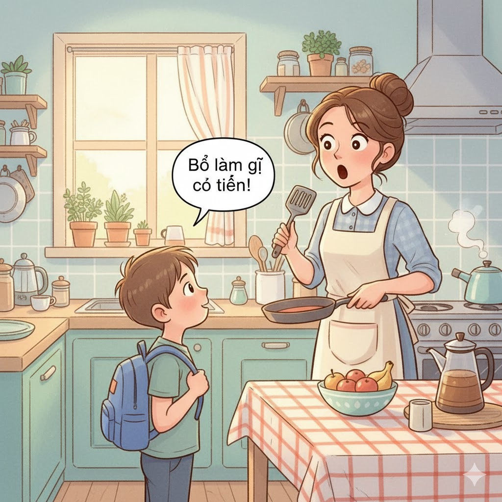 – Mẹ ơi, sáng nay Mẹ cho con xin tiền đóng học phí nha Mẹ?