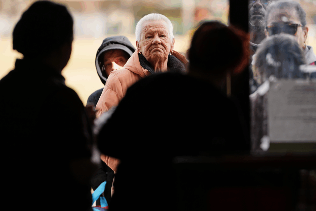 ChatGPT said: Fran Cooper xếp hàng chờ nhận thực phẩm khẩn cấp tại Chương trình Thực phẩm Mitzvah của Liên đoàn Do Thái vùng Philadelphia, thứ Sáu ngày 7 tháng 11 năm 2025. (Ảnh AP/Matt Rourke)