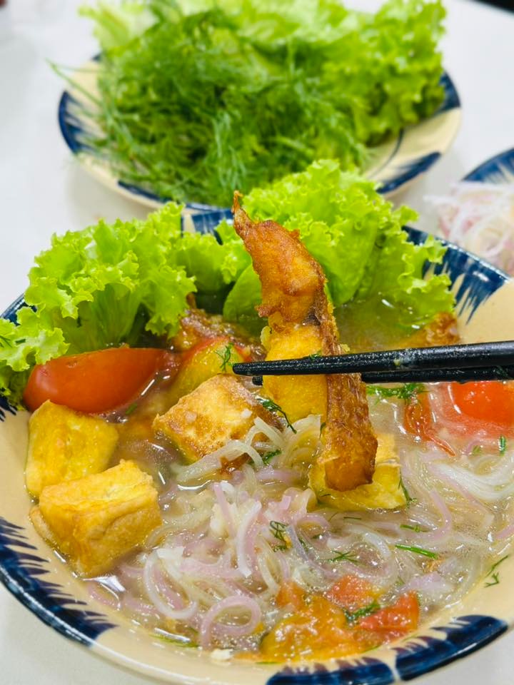 - Hoàn thiện: Cho hủ tiếu ra tô, xếp cá chiên, đậu hũ, thêm thì là và rau sống. Chan nước lèo nóng hổi lên trên.