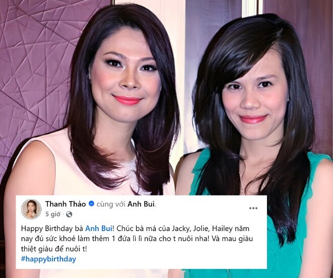 Giọng ca Búp bê không tình yêu nhắn nhủ: "Happy birthday bà. Chúc bà má của Jacky, Jolie, Hailey năm nay đủ sức khoẻ làm thêm 1 đứa lì lì nữa cho tui nuôi nha! Và mau giàu thiệt giàu để nuôi tui".