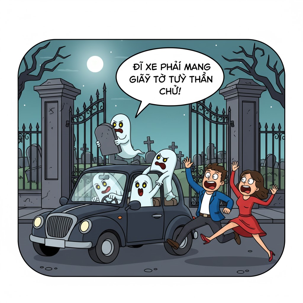 Vừa ló mặt ra, đôi tình nhân hoảng hốt bỏ của chạy lấy người. Hai con ma hí hửng trèo lên xe.