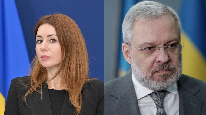 Bộ trưởng Tư pháp Herman Halushchenko (bên phải) và Bộ trưởng Năng lượng Svitlana Hrynchuk đã đệ đơn từ chức lên Thủ tướng Ukraine Yulia Svyrydenko. Ảnh: Getty Images