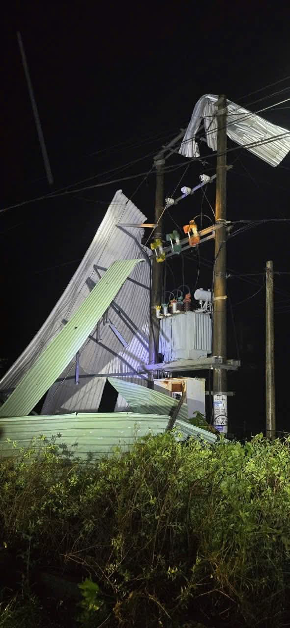 Tấm lợp nhà dân bị gió lốc cuốn vướng vào trụ điện. Ảnh: ĐNO