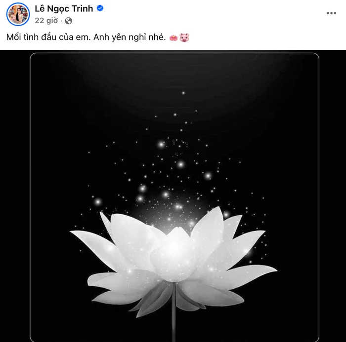 Mới đây, trên trang cá nhân, diễn viên Ngọc Trinh đã bất ngờ thông báo tin buồn khi bạn trai cũ, cũng là mối tình đầu của nữ diễn viên qua đời. Ngọc Trinh chia sẻ ảnh hoa sen trắng đen, kèm theo dòng trạng thái đầy xót xa: "Mối tình đầu của em. Anh yên nghỉ nhé".