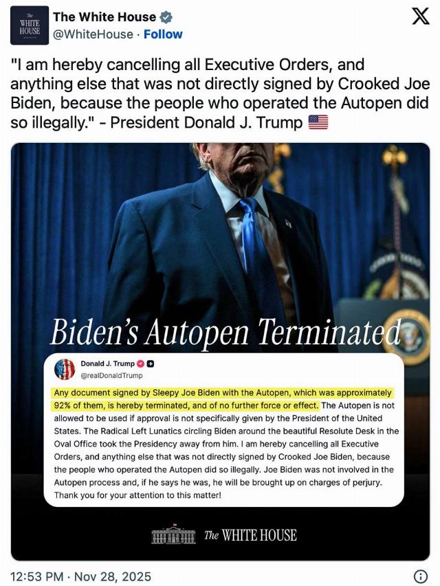 In a move that underscores a commitment to transparency and proper presidential authority, President Donald J. Trump announced on Nov, 28, 2025, the nullification of executive orders and other documents from the Biden administration that were signed using an autopen without direct presidential involvement.