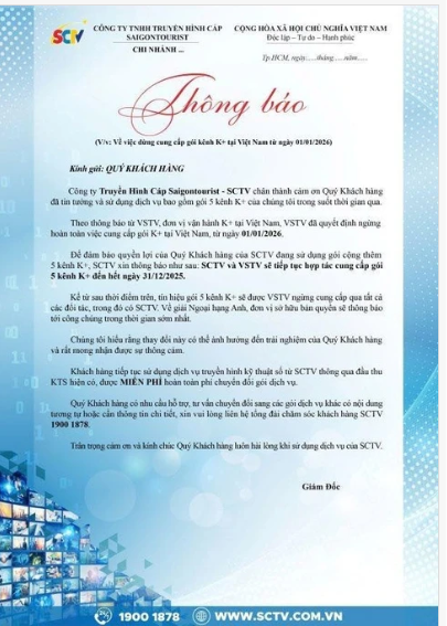 Trong thông báo gửi khách hàng, SCTV cho biết VSTV sẽ không duy trì nhóm kênh K+ từ ngày 1/1/2026.