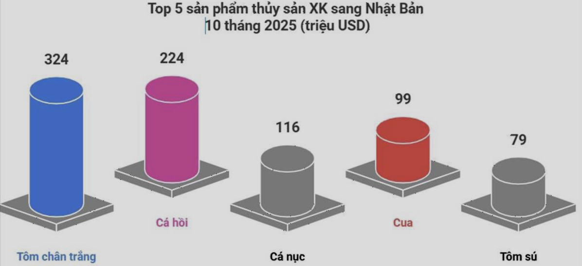 Thống kê của Hiệp hội Chế biến và Xuất khẩu Thủy sản Việt Nam (VASEP), xuất khẩu thủy sản Việt Nam sang Nhật Bản trong 10 tháng năm 2025 đạt 1,445 tỷ USD. Con số này tăng 15,2% so với cùng kỳ năm ngoái. "Đây được xem là điểm tích cức giữa bối cảnh thị trường Nhật Bản đang "co mình" vì lạm phát, đồng Yên lao dốc và tiêu dùng nội địa suy yếu kéo dài", VASEP nhận định.