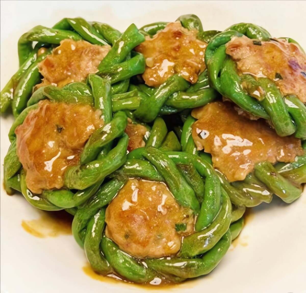 - Cho hành lá thái nhỏ, nước tương nhạt, dầu hào và một chút muối vào thịt heo xay, trộn đều. Cuộn đậu đũa lại thành vòng tròn và đặt nhân thịt đã chuẩn bị vào giữa.