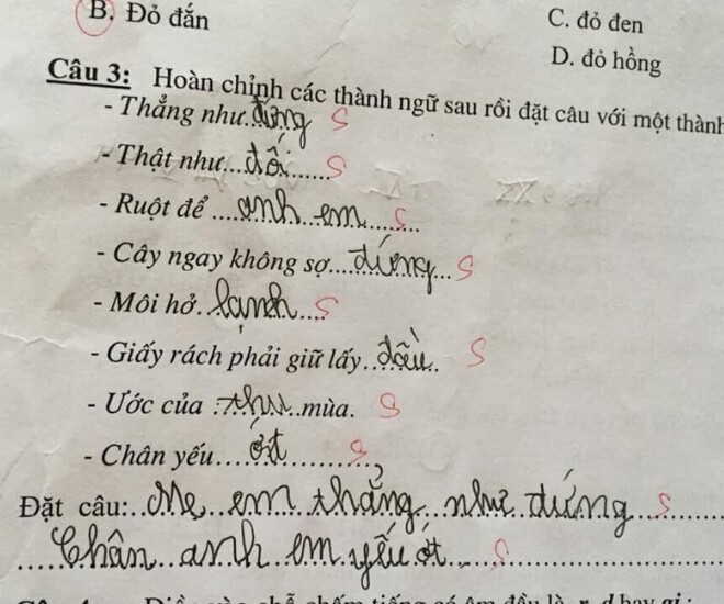 Cụ thể, bé học sinh đã viết "Thẳng như đứng; Thật như đối; Ruột để anh em; Cây ngay không sợ đứng; Môi hở lạnh; Giấy rách phải giữ lấy đầu”... Không dừng lại ở đó, đứa trẻ còn khiến cô giáo đi từ hết bất ngờ này đến bất ngờ khác khi nhắc đến mẹ và anh trai trong phần đặt câu, nhưng tất nhiên thành quả vẫn “lạ lắm”, vẫn không tiến triển bao nhiêu.