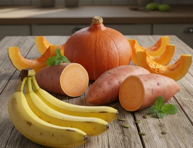 Các món giàu kali như chuối, khoai lang, bí đỏ... rất cần thiết cho chế độ ăn cải thiện huyết áp