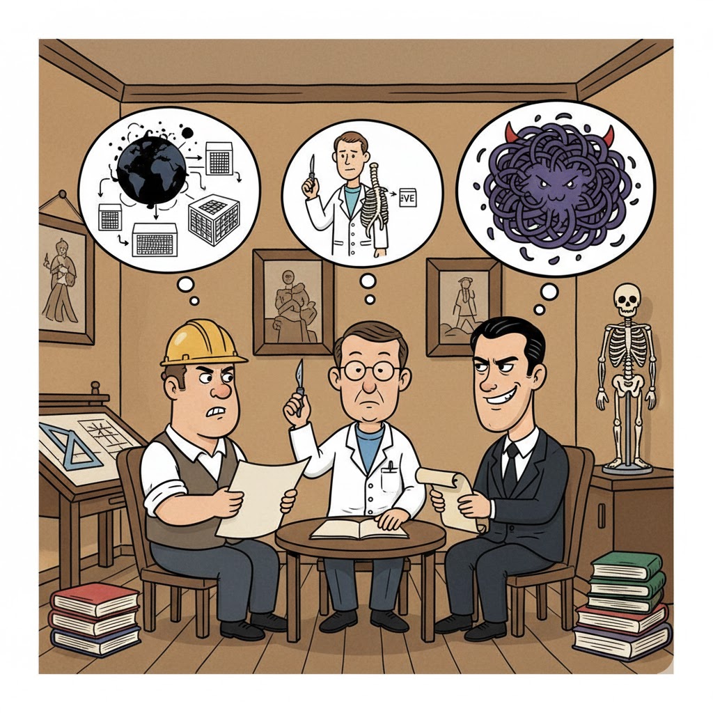 Luật sư nhấp một ngụm trà, mỉm cười một cách bí hiểm: "Các anh nhầm cả rồi. Các anh còn nhớ lời kỹ sư nói không? 'Tạo ra trật tự từ sự hỗn loạn'. Nếu không có sự hỗn loạn đó, thì làm sao có việc gì để làm? Vậy ai đã tạo ra sự hỗn loạn ngay từ đầu? Chắc chắn đó phải là Luật sư!"