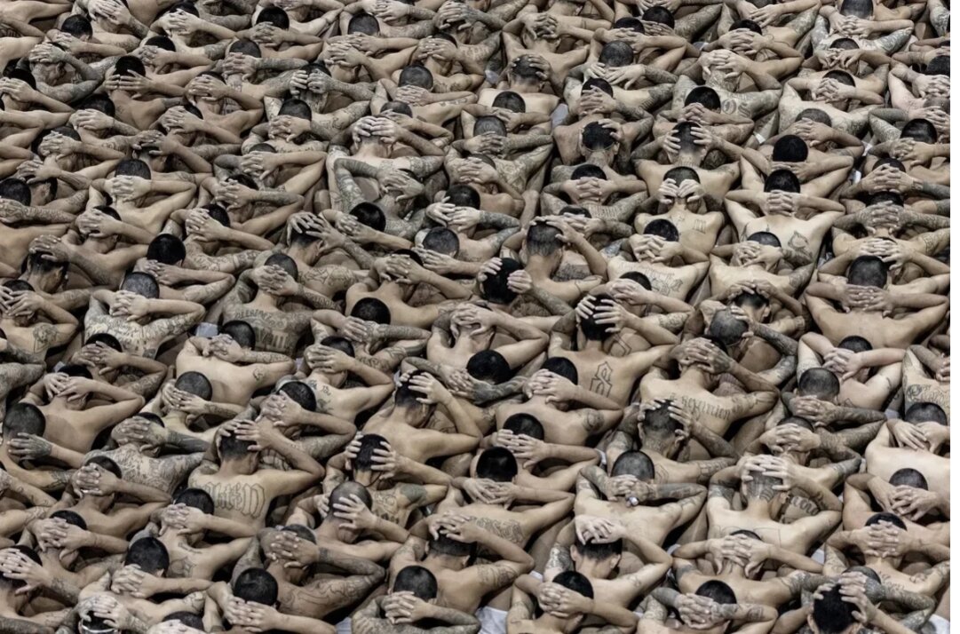 Thành viên các băng đảng chờ đợi xếp phòng giam tại "siêu nhà tù" CECOT của El Salvador hồi tháng 6/2024. Ảnh: Reuters.