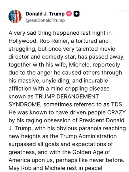 Bi kịch càng trở nên nhức nhối hơn khi Tổng thống Donald Trump đăng tải bài viết trên mạng xă hội Truth Social, ám chỉ cái chết của Rob Reiner có liên quan đến cái gọi là “hội chứng cuồng chống Trump”.
