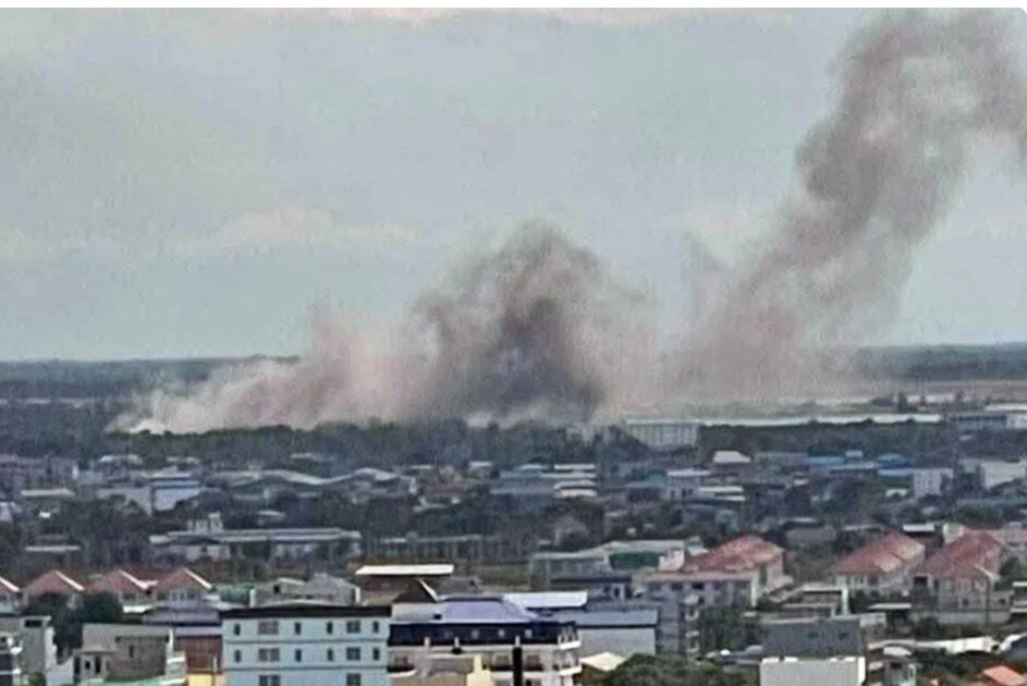 Khói bốc lên sau khi máy bay chiến đấu Thái Lan không kích Poipet. Ảnh: Quân đội Thái Lan.