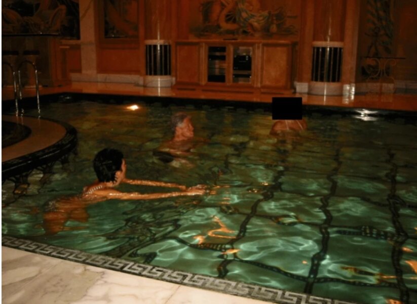 Ông Clinton xuất hiện trong bể bơi cùng Ghislaine Maxwell, đồng phạm của Epstein, và một phụ nữ trẻ. Ảnh: DOJ.