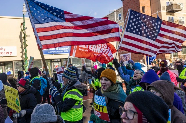 Người biểu tình tuần hành trong điều kiện giá rét, với nhiệt độ gần âm 12 độ C, tại một khu dân cư ở bang Minnesota nhằm phản đối chính phủ trấn áp nhập cư