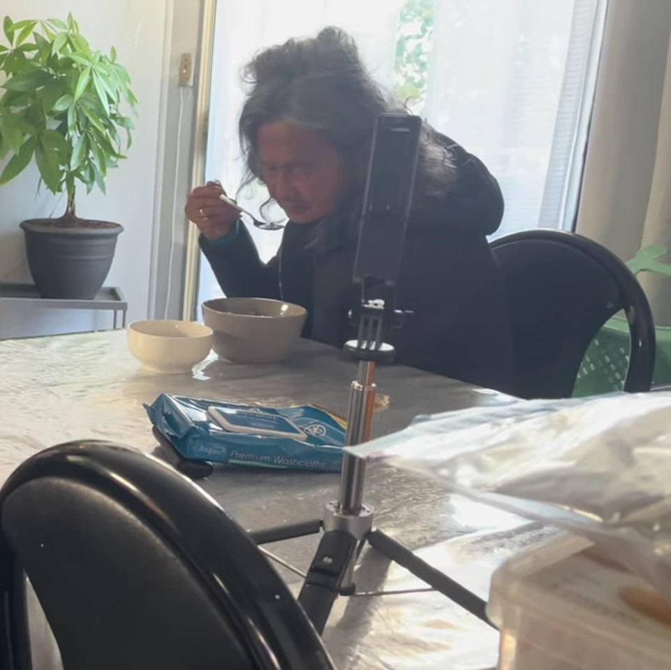 Bà chủ chia sẻ: "Kim Ngân đổ bệnh rồi, nằm từ trưa tới giờ. Tôi thấy vậy liền nấu canh khoai mỡ và cá cơm, chiên trứng cho Kim Ngân ăn, nhưng Kim Ngân chỉ ăn được một chút, giờ bỏ hết lại không ăn. Tôi kêu uống thuốc thì Kim Ngân chạy mất rồi, không chịu uống. Kim Ngân có vẻ đang lạnh".